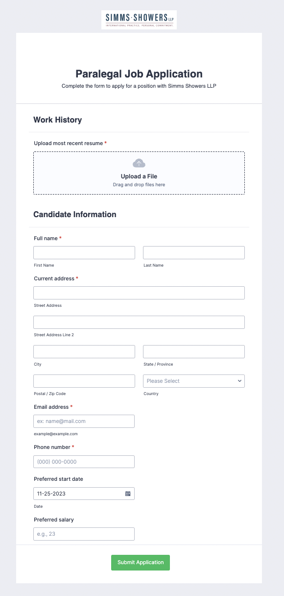 In the embedded link, candidates are directed to an online form where they can apply for the job by: uploading their resume, entering their first name, last name, current address, email address, phone number, preferred start date and preferred salary.